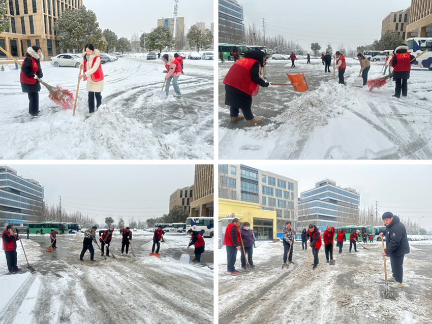 清晨寒風(fēng)刺骨,但現(xiàn)場(chǎng)干勁如火。大家身著醒目的紅色志愿馬甲,在皚皚白雪中迅速集結(jié),分成三個(gè)小組高效投入清雪作業(yè):一組負(fù)責(zé)集團(tuán)大樓正門(mén)前區(qū)域,他們揮動(dòng)鐵鍬,一鍬接一鍬奮力破除凍結(jié)的冰層;第二組沿主干道左側(cè)推進(jìn),他們手持掃帚與鏟子,細(xì)致清掃積雪、疏通通道;第三組則專(zhuān)注右側(cè)區(qū)域,他們默契配合,有人撒布融雪劑、有人鏟雪、有人及時(shí)掃雪,確保臺(tái)階和坡道防滑安全。沒(méi)有雪板,就用鐵鍬推、用掃帚攏;冰層太硬,就輪番上陣、接力攻堅(jiān)。盡管寒風(fēng)凜冽、鞋襪濕透、雙手凍得通紅,卻無(wú)一人退縮。鐵鍬撞擊地面的鏗鏘聲、掃帚劃過(guò)雪面的沙沙聲,匯聚成冬日里溫暖有力的奮進(jìn)旋律。